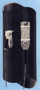 São usados dois pares de sensores como os mostrados ao lado. O sensor da direita é um transdutor de deformação específica. Ele gera uma tensão proporcional à deformação sofrida pelo material da estaca durante o golpe. O sensor da esquerda é um acelerômetro, que gera uma tensão proporcional à aceleração das partículas da estaca. O sinal de cada um dos transdutores de deformação é multiplicado pelo módulo de elasticidade do material da estaca e pela área de seção na região dos sensores, para obtenção da evolução da força em relação ao tempo. Por isso esses transdutores as vezes são chamados de sensores de força. O PDA tira a média dos dois sinais de força assim obtidos, a fim de detectar e compensar os efeitos da excentricidade do golpe. O sinal de cada um dos acelerômetros é integrado, para obtenção da evolução da velocidade de deslocamento da partícula com o tempo. Por isso esses transdutores as vezes são chamados de sensores de velocidade. Da mesma forma que os sinais de força, o PDA também trabalha com a média dos dois sinais de velocidade assim obtidos. |